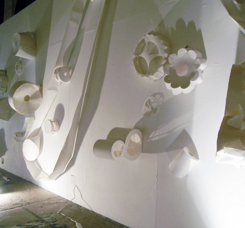 Aucune machine ne reste célibataire. Comme dans un bal, elles se mettent à tournoyer et exerce leur pouvoir d’attraction. Toute cette mécanique devient soudain spectacle à vitesse ralentie. La projection de ces formes les libère de leur condition de simple outillage. Mon objectif est de créer un environnementéphémère et inachevé. La lumière joue un rôle important. A travers ces projections, je réduis les limites entre la machine et l’homme. Le carton plume et le papier sont les matériaux qui me sont apparus les plus justes pour cette mise en scène. Le papier m’offrait à la fois la rigueur et la mollesse. Les roues poussaient toutes seules. Quant au carton plume, sa légèreté m’a permis d’imaginer des formes de grandes envergures, une découpe directement dans l’espace. Leur fragilités est là pour rappeler d’autres fragilités. Rien n’est fait pour durer.
